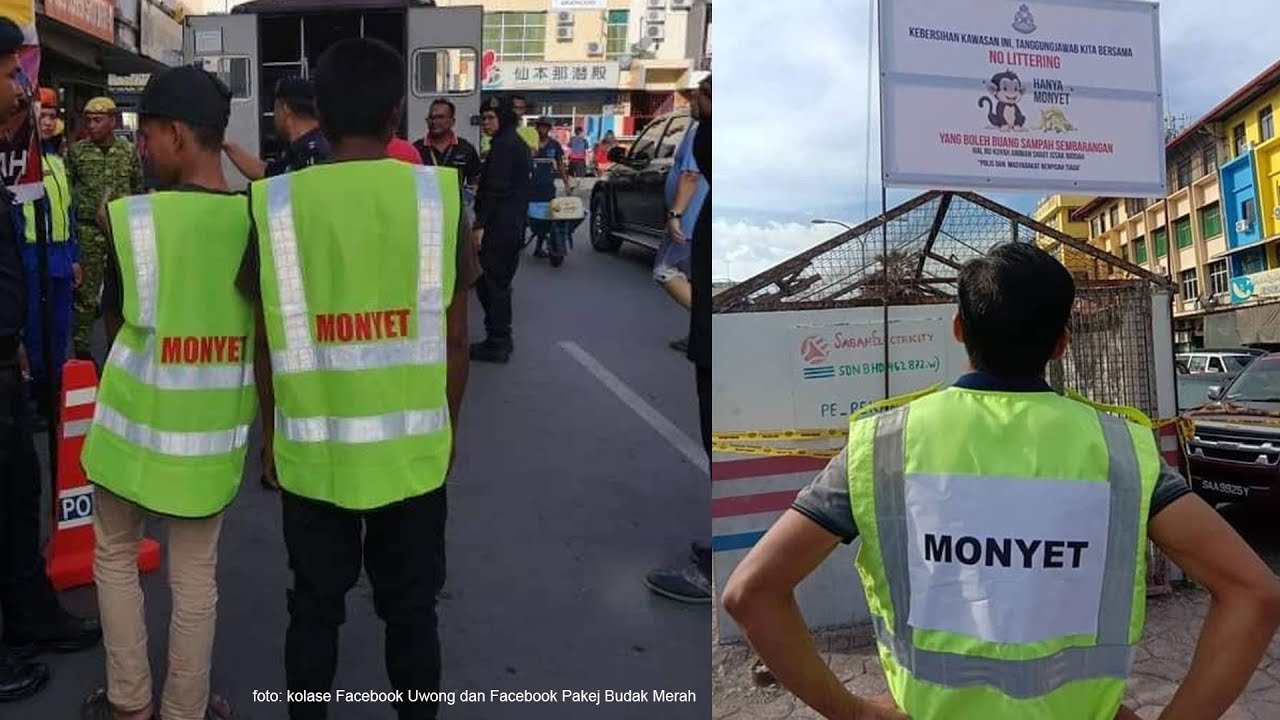 Foto yang beredar di media sosial memperlihatkan bentuk hukuman bagi pembuang sampah sembarangan di Semporna pakai rompi yang bertuliskan 'MONYET'.