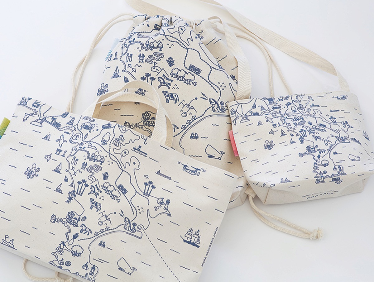 生地に描かれているのは、海に囲まれた三浦半島。地図上にはソレイユの丘の観覧車やウミウが憩う城ヶ島、逗子葉山の海に浮かぶヨットなど、名所のイラストが散りばめられている。