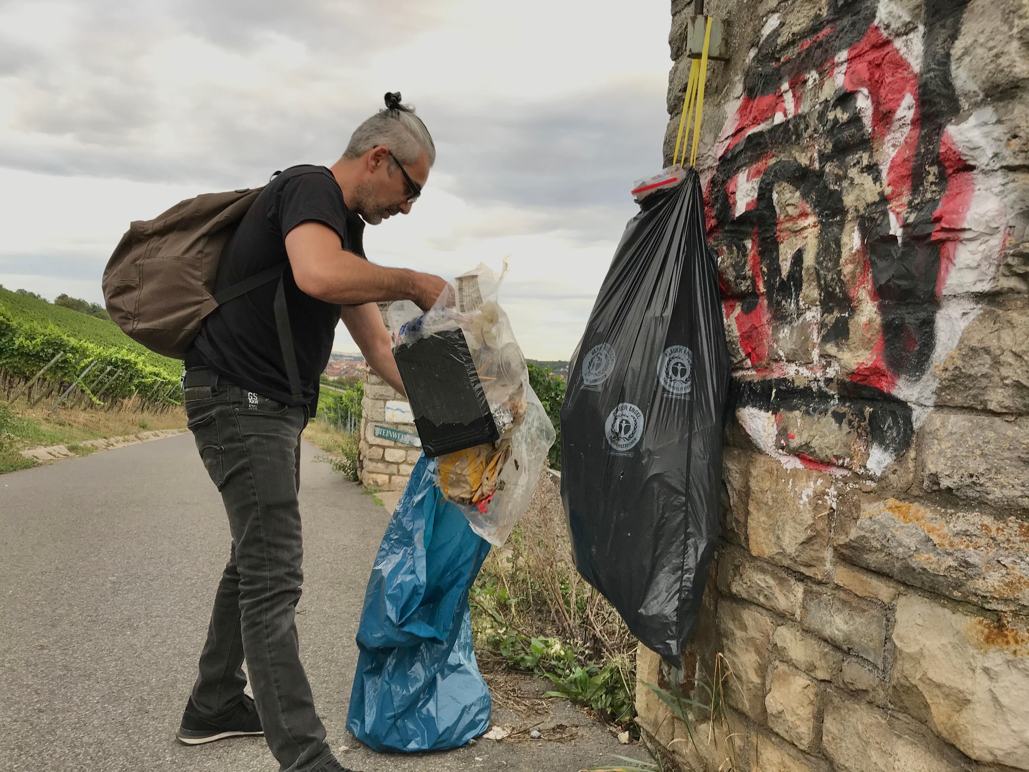 Weil die Gruppe so groß ist, teilt sie sich im Weinberg auf. "So können wir ein noch größeres Gebiet ablaufen, das ist super", freut sich Serhat Divrik. Der Initiator der Aktion liebt den Würzburger Stein, wie er sagt. Der Mediendesigner kommt oft zum Joggen oder auch zum Meditieren hierher. Und jedes Mal nimmt er Müll mit nach Hause - auch wenn er nicht in der Gruppe unterwegs ist. Dem 49-Jährigen ist es wichtig, dass seiner Einschätzung nach nicht nur junge Leute ihren Müll liegen lassen. "Dreckspatzen gibt es in jeder Altersgruppe." Wenn er solchen "Dreckspatzen" in den Weinbergen begegne, dann sei er am besten damit gefahren, "ohne erhobenen Zeigefinger" zu agieren. "Ich frage dann einfach höflich, ob ich den Müll wegschmeißen darf. Das wirkt am besten", so Divrik.